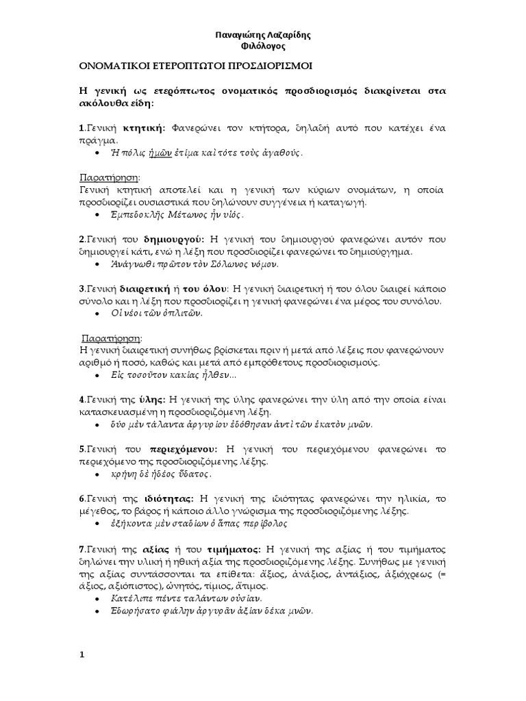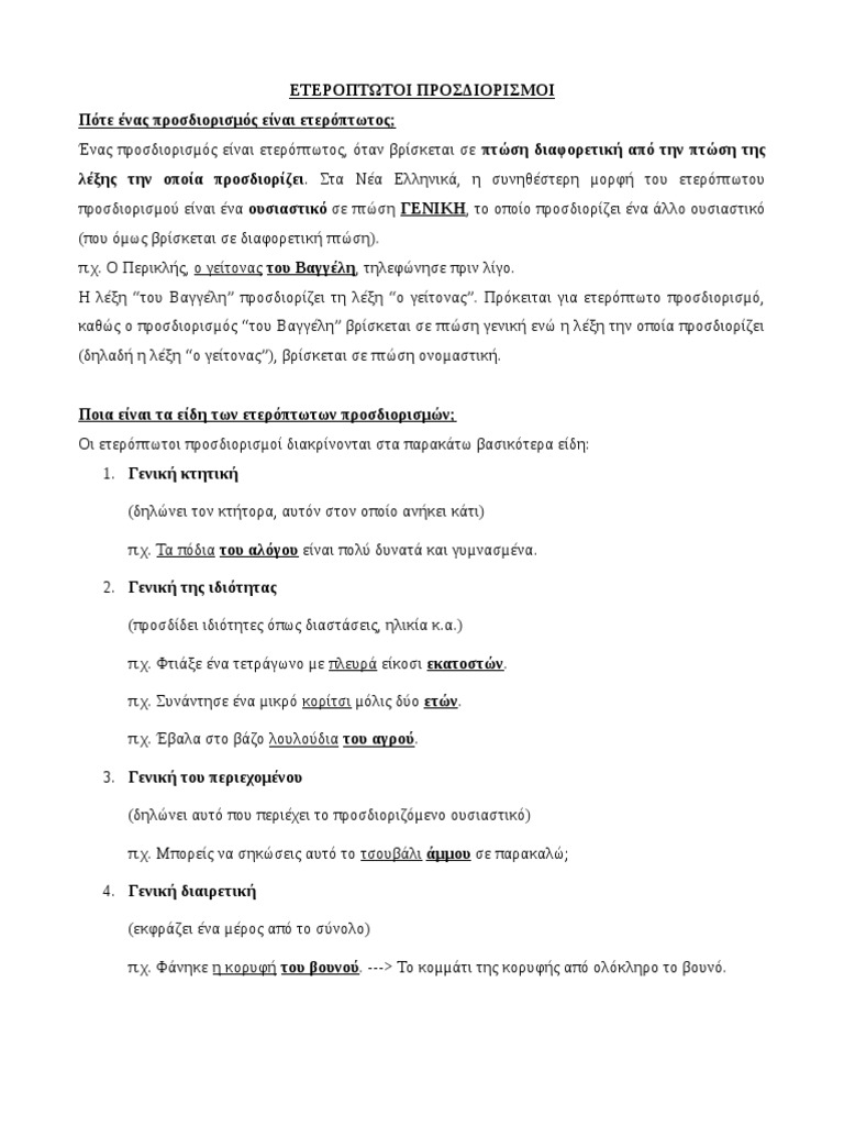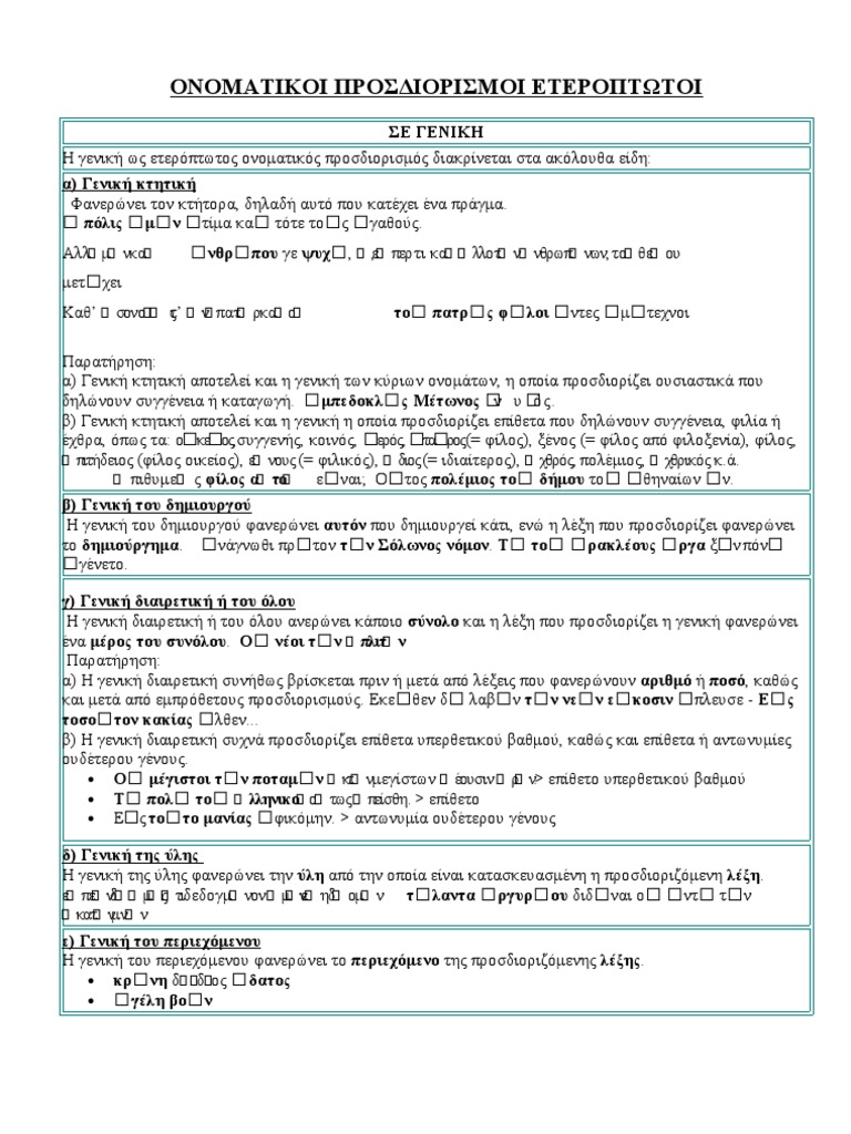 Ετεροπτωτοι Προσδιορισμοι : H Genikh Ws Eteroptwtos Onomatikos Prosdiorismos / Οι ονοματικοί ετερόπτωτοι προσδιορισμοί είναι ονόματα ή αντωνυμίες σε διαφορετική πτώση από τα ονόματα ή τις άλλες λέξεις που προσδιορίζουν.. Ετερόπτωτοι ονοματικοί προσδιορισμοί σε γενική. ► ἡμῶν → γενική κτητική στο « τήν πόλιν». Οι ετερόπτωτοι ονοματικοί προσδιορισμοί προσδιορίζουν ονόματα ή άλλες λέξεις που έχουν θέση ονόματος. · την κτήση (→ γενική κτητική): Α) την παράθεση και β) την.